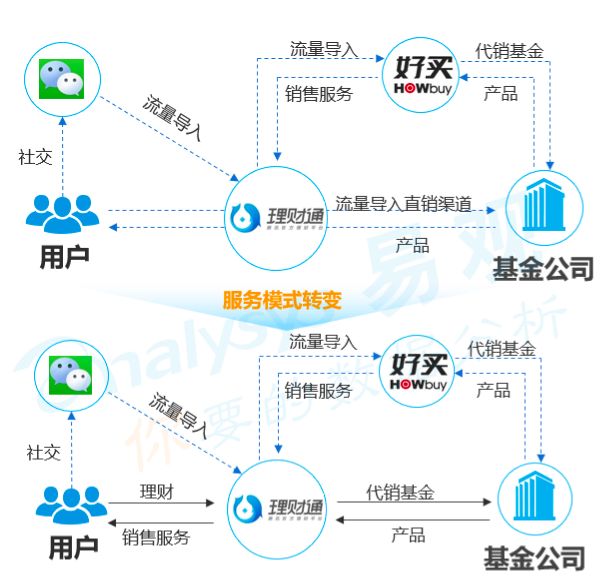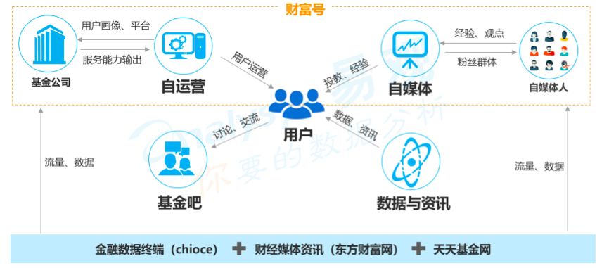 天天基金网也通过“自运营+自媒体”为内核构筑用户服务生态,基金公司通过自运营平台开展用户运营,基于天天基金提供的用户画像数据开展个性化的营销与运营服务,自媒体人通过经验观点的传播影响用户群体,同时天天基金网为用户提供咨询和数据服务,基金吧为用户提供交流、讨论平台,形成成熟的用户服务体系。