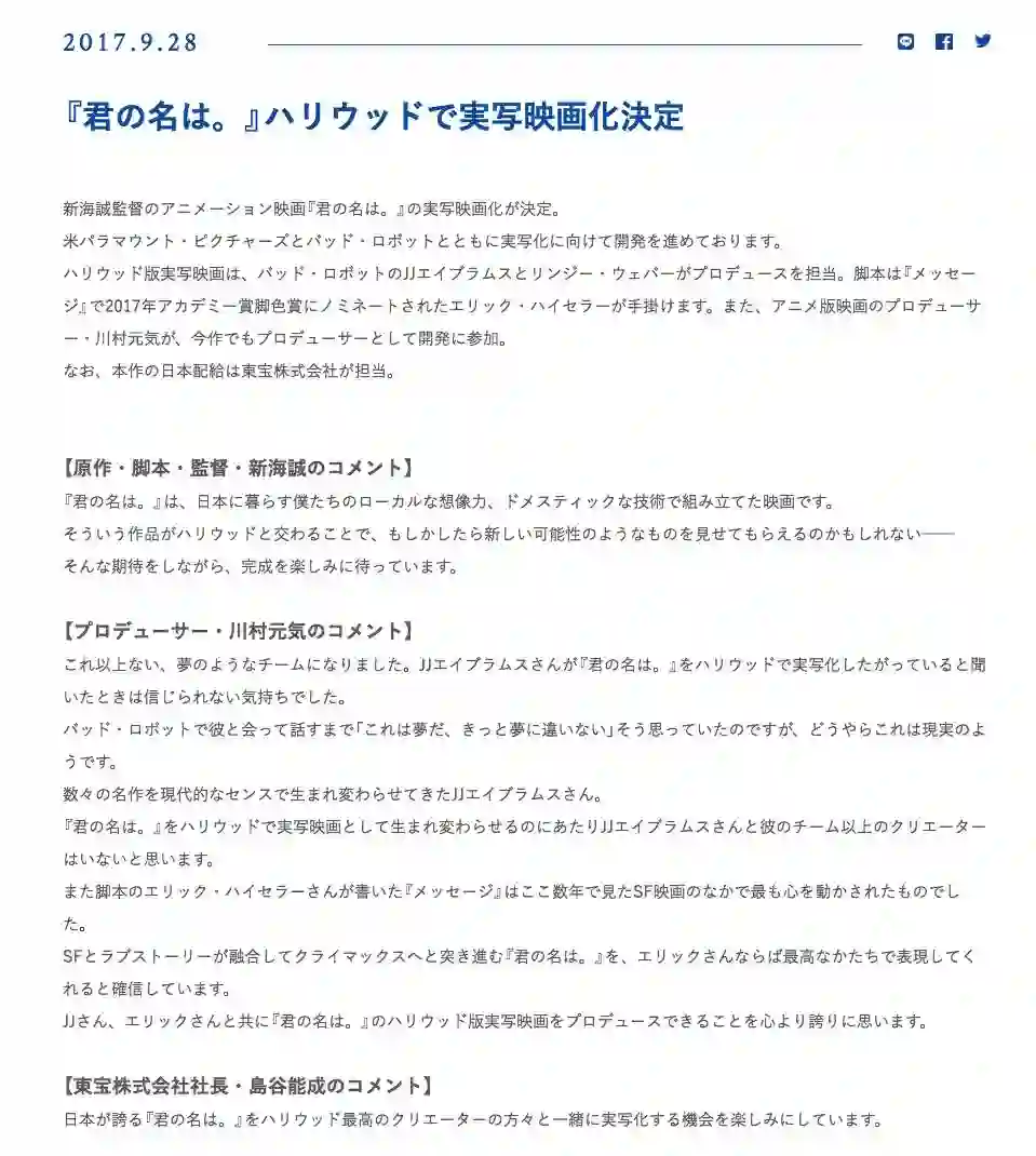 今天,派拉蒙与坏机器人制作公司宣布,已经获得了日本动画电影《你的名字。》的改编权,将推出这部动漫电影的真人版电影。据悉,《你的名字。》好莱坞真人电影将由J·J·艾布拉姆斯、琳赛·韦伯、川村元気担任制作人,电影《降临》的编剧埃里克·海瑟尔担任本作的脚本。