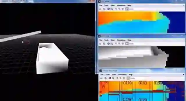 仿真结果。左:收割机吊杆和拖车。右上:摄像头输出。右下:距离和填充水平。