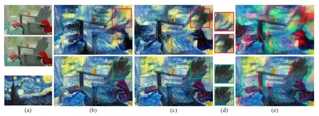 该网络还可以很容易地通过集成 [10] 中的子网络扩展到立体 3D 视频中。这样,最终的风格化结果不仅可以保持每个时间步的水平空间一致性,而且可以保持相邻时间步之间的时间连贯性。这项工作可能会启发电影创作者考虑自动地将 3D 电影或电视转变为名画风格。
