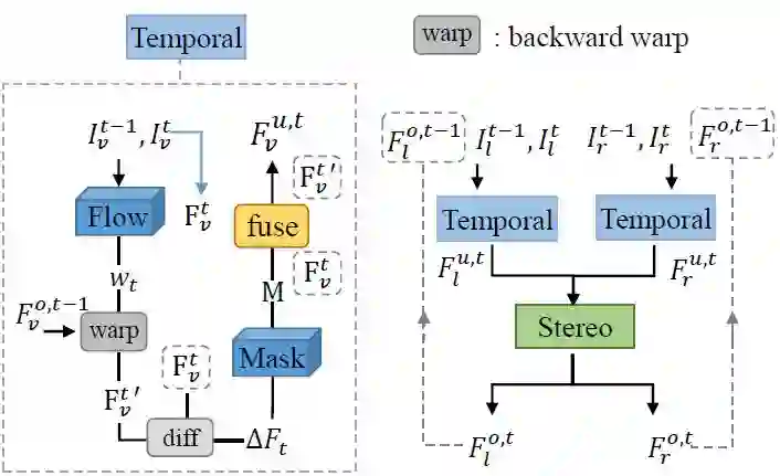 图 4. 立体视频风格迁移的总体结构。左边是时间网络的简化工作流。右边是用于结合上述立体网络和左边附加的时间网络的递归公式。