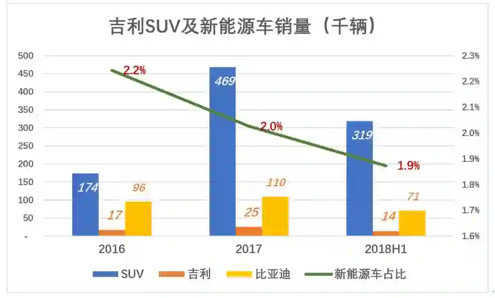 吉利新能源车销量占比不到SUV的零头。2018年H1,吉利销售新能源车1.44万辆(比亚迪达7.1万辆),占比仅为1.9%。5年计划只剩下1年半,吉利新能源车占比距90%的既定目标却越来越远。