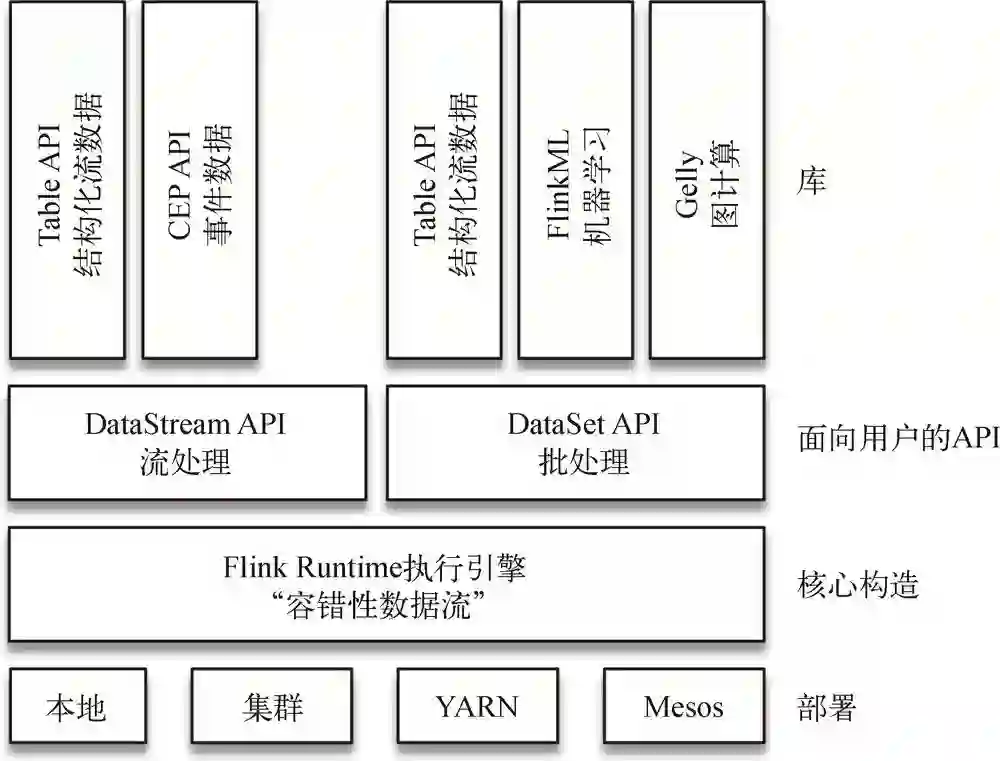 图 1-4:Flink 技术栈的核心组成部分。值得一提的是,Flink 分别提供了面向流处理的接口(DataStream API)和面向批处理的接口(DataSet API)。因此,Flink 既可以完成流处理,也可以完成批处理。Flink 支持的拓展库涉及机器学习(FlinkML)、复杂事件处理(CEP),以及图计算(Gelly),还有分别针对流处理和批处理的 Table API。
