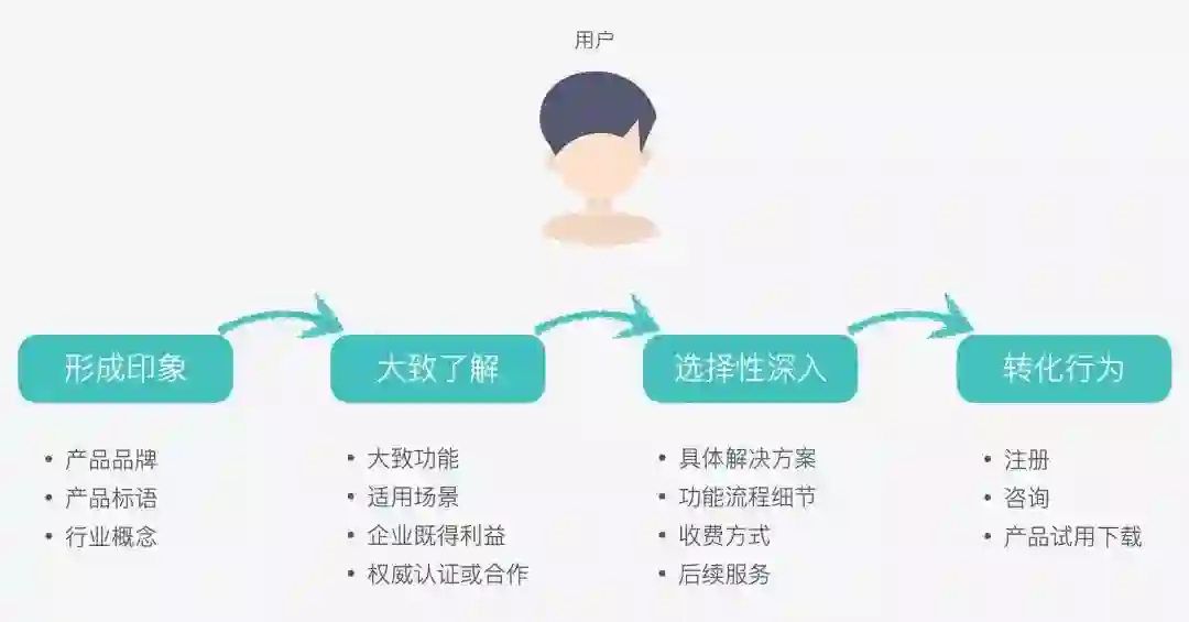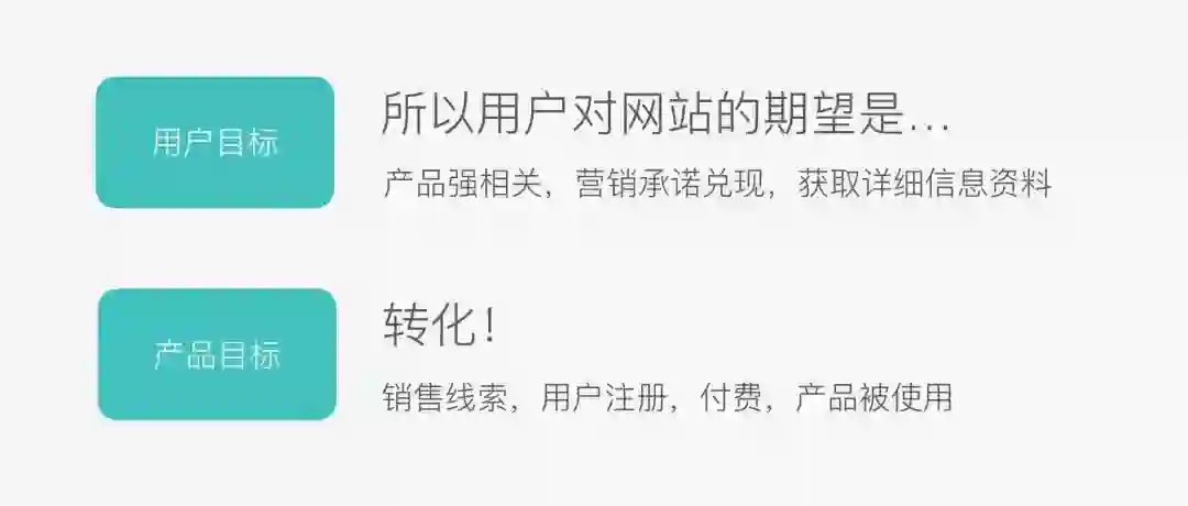 用户在前面所提到的场景下来到网站,肯定是有他们要达成的目的。比如通过搜索关键词来到网站,会需要强相关的产品内容和更详细的资料,而通过运营销售渠道进入,则可能更需要活动承诺的兑现。