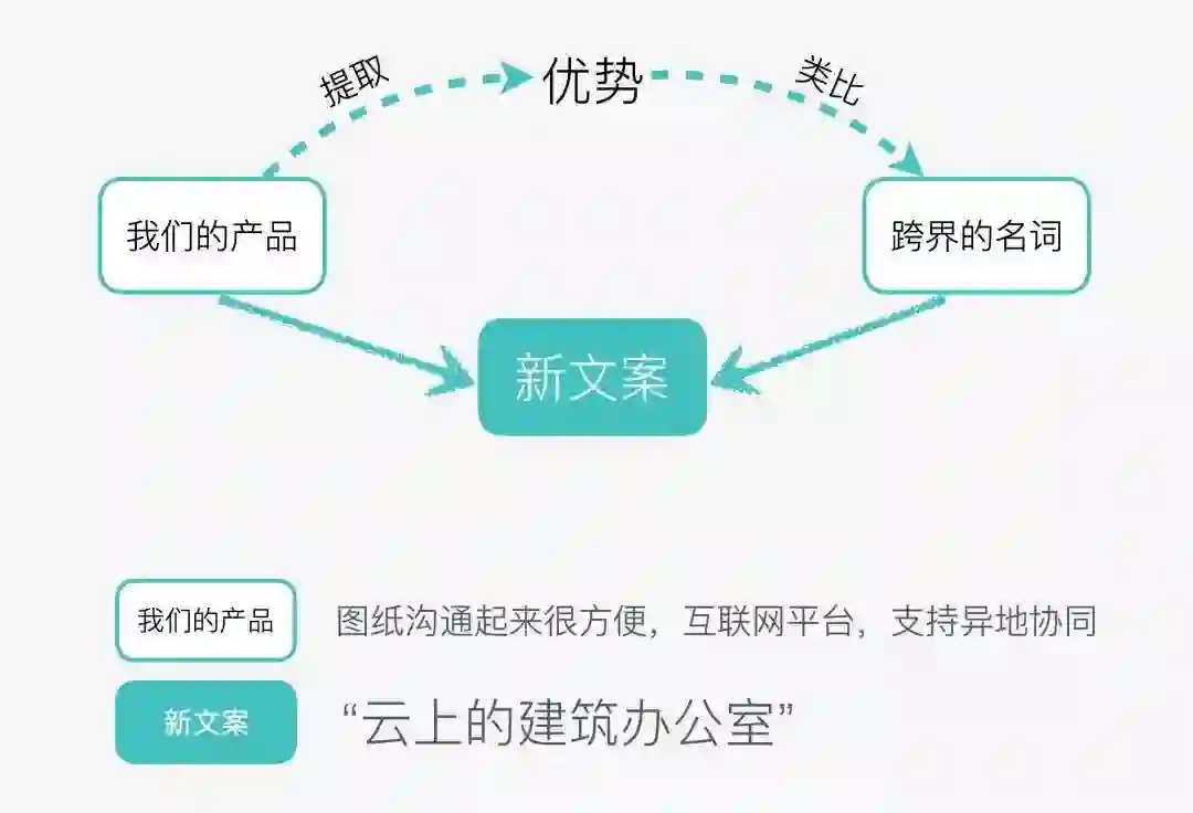 具体思路是,首先抽取当前产品的优势,这些优势可以用一个用户最能理解的现有的词来类比,接着将这个词与现有产品结合形成新的文案。最终的这个文案,是用户能够理解的同时又能反映出产品优势的。