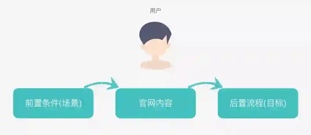 官网实际上是用户与产品的一个接触点,我们需要把官网内容放到一个完整的体验流程里来看。以下是一个非常粗略的用户体验路径。用户一定是在某些前置条件之后,开始访问官网。了解了官网的内容之后,接下来会有进一步的流程或者要达到的目的地。其实就是我们在平时工作中会思考的:一群怎样的用户在什么样的场景下访问官网,并最终要达到什么目标。
