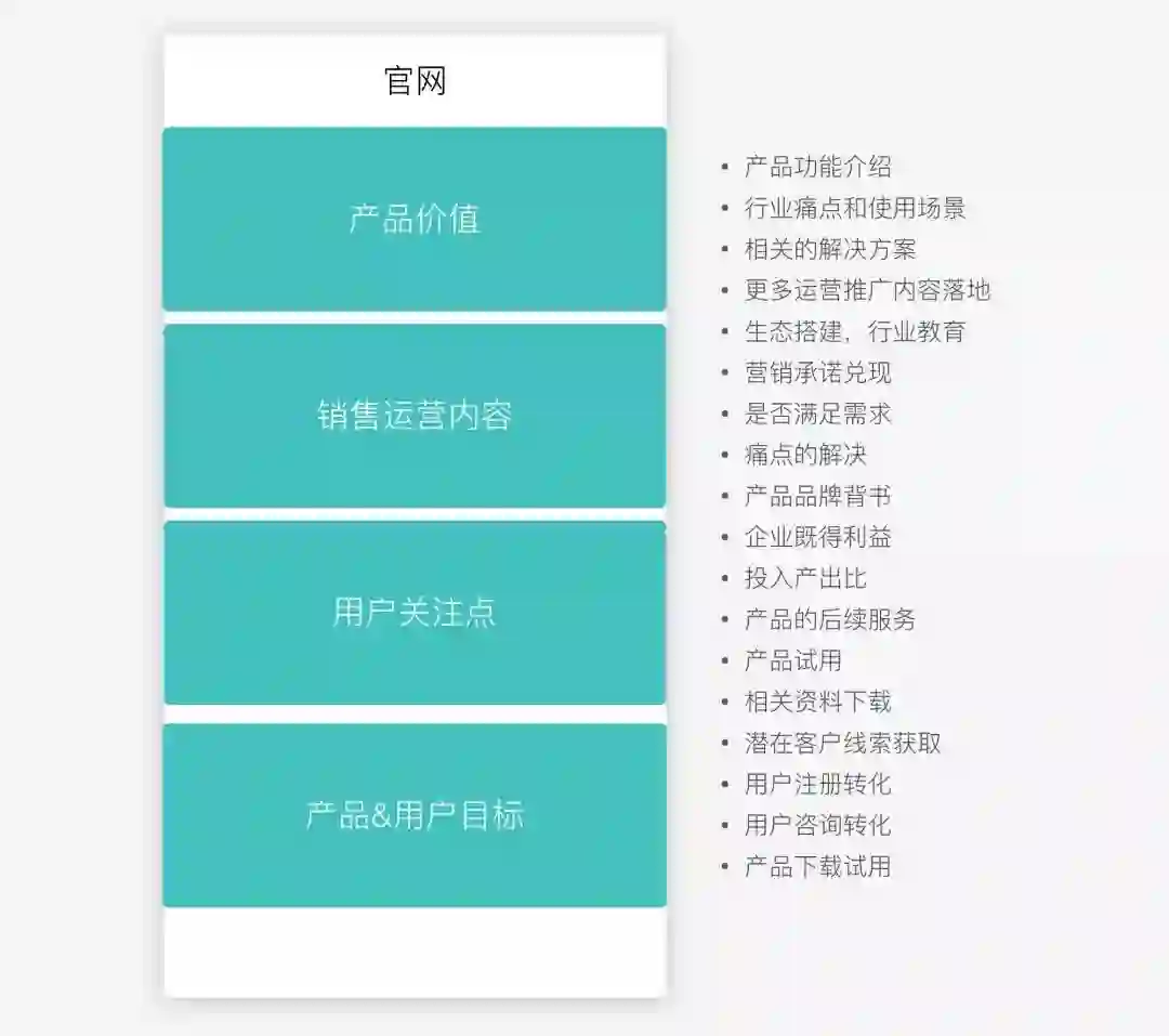在上文中,我们已经输出了产品本身价值的介绍内容,同时,在分析用户体验路径过程中又梳理出的一些需要额外补充的内容。官网整体包含的内容可以汇总如下: