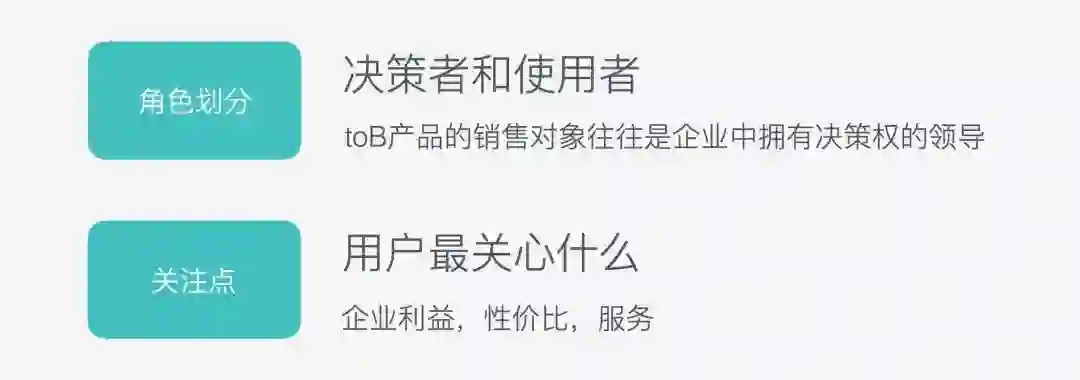 B端产品相较于C端产品有一个比较特殊的点,即用户角色会有明显的划分,分为决策者和使用者。使用者不用说,是真正使用产品的人。而决策者却能够决定一个企业是否采购我们的产品。很明显,B端产品的官网主要目标用户是决策者。那这些决策者有哪些不同呢?主要是对产品的关注点不一样。使用者可能更关注易用性,而决策者却需要站在更高的角度来评估产品,比如是否能提高企业整体工作效率,性价比,后续的服务支持等等。所以我们的官网需要针对这群人的关注点提供相应的内容。
