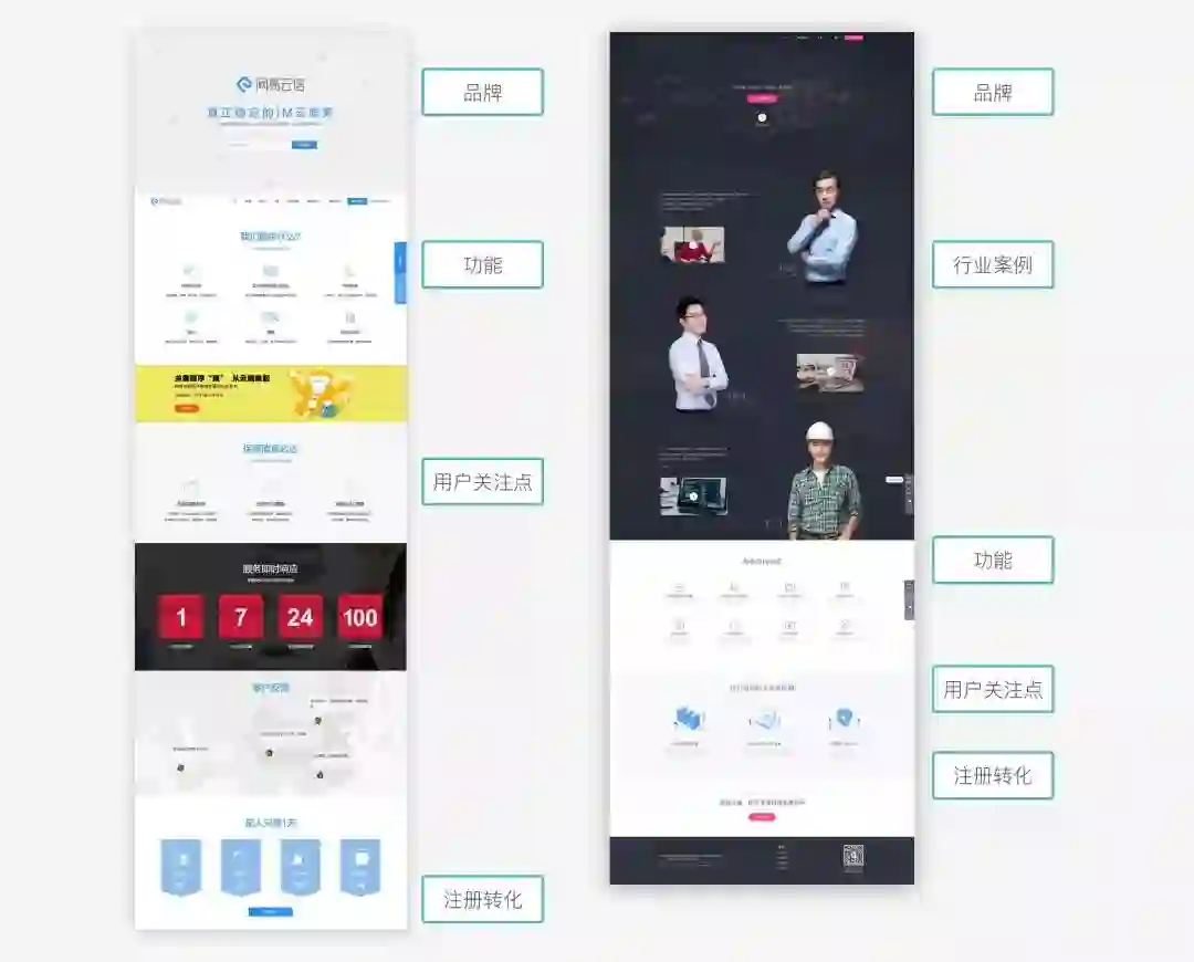 但是值得注意的是,“套路”不一定适合所有产品。为什么这么说呢?以笔者做过的两个B端项目举例,一个是网易云信,一个是网易孵化产品。以下是两个官网的对比。