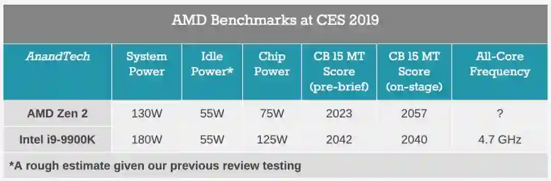 AnandTech 检测到的系统闲置平均功耗为 55w,那么英特尔的 9900k 功耗大约为 125w,而 AMD 的 Zen 2 大约为 75w。