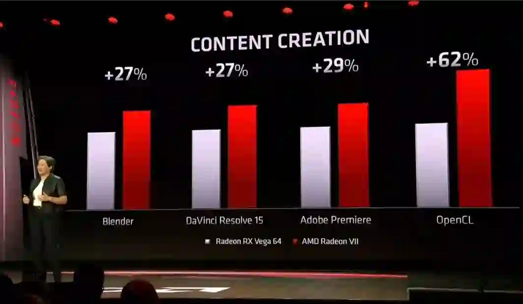 Radeon VII 采用经过调整的 Vega 20 架构,包含 60 个计算单元。这款显卡还配备了 16GB HBM2 内存,可提供 1TB / s 的内存带宽,单精度算力可达 13.8 TFlops。AMD 总裁兼首席执行官苏姿丰介绍称,第二代 Vega 架构的性能与上一代(12nm 制程)相比性能提升了 25-42%。AMD 展示了新显卡在 4k 分辨率、最高图形设置加「超过 60FPS 刷新率」的条件下运行「鬼泣 5」的表现。