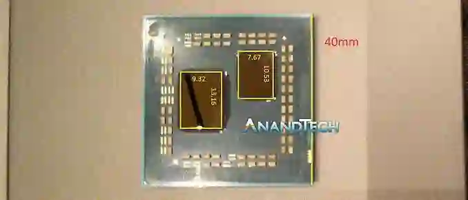 我们可以根据该处理器的图像测量一下。已知 AM4 处理器为 40 x 40 平方毫米,那么该芯片大小应该为 10.53 x 7.67 = 80.80 平方毫米,而 IO 芯片为 13.16 x 9.32 = 122.63 平方毫米。图片来自 AnandTech。