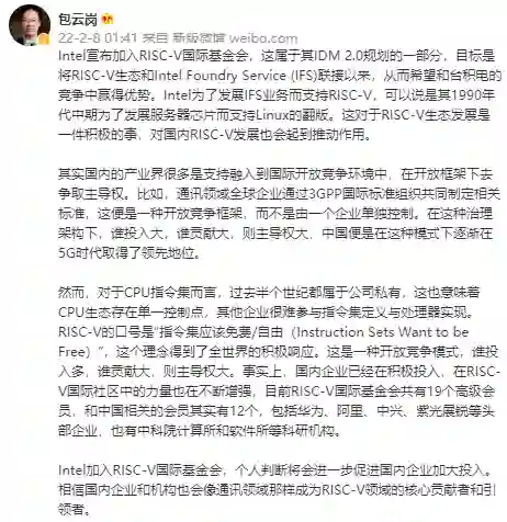 中国科学院计算技术研究所研究员、中国开放指令生态(RISC-V)联盟秘书长包云岗也为此发博表示,这将对国内形势产生一定影响:“Intel 加入 RISC-V 国际基金会,个人判断将会进一步促进国内企业加大投入。相信国内企业和机构也会像通讯领域那样成为 RISC-V 领域的核心贡献者和引领者。”
