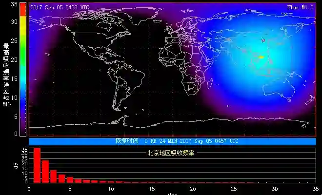 电离层突然骚扰会引起向阳面电离层的电离增加,影响短波通讯。北京时间9月5日白天发生的几次M级耀斑,导致12:45开始我国绝大部分地区电离层发生短波吸收现象,部分地区发生全吸收,事件持续至13:30。