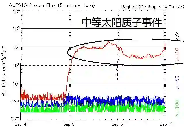 太阳质子事件是指地球同步轨道处,能量大于10MeV的质子流强度连续15min达到或超过10pfu的事件。比较大的太阳质子事件会导致地球所有轨道的单粒子效应的明显增加。北京时间9月5日的M5级耀斑,已经引起了两年多都未曾出现的中等太阳质子事件,而9月6日爆发的X9级特大耀斑,导致太阳质子通量的再次走高。