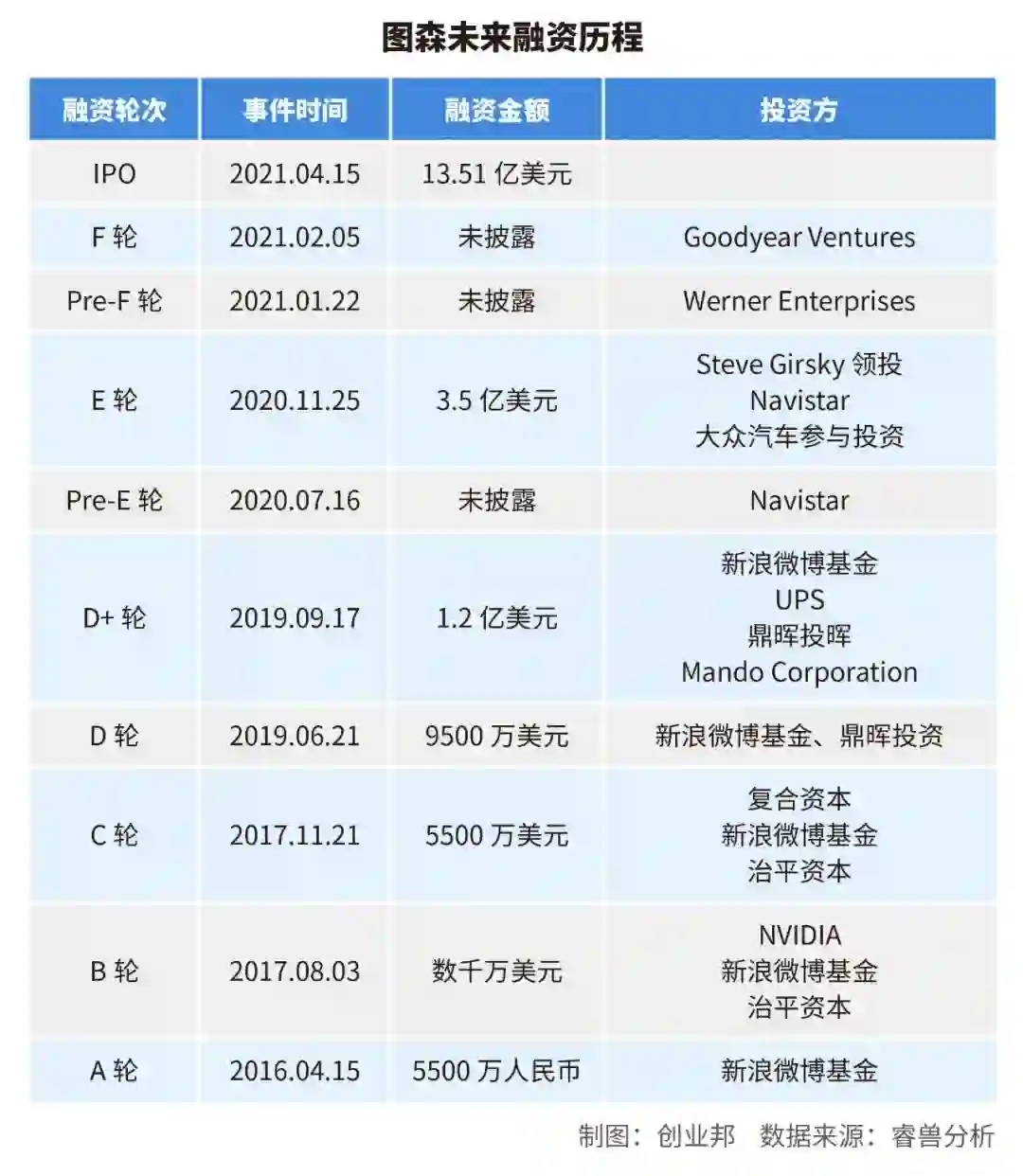 D+轮之后,大众汽车集团、Navistar(美国卡车品牌)、Goodyear Ventures(固特异创投)、Werner Enterprises(沃纳,美国一家物流运输公司)等也先后投资了Pre-E到F轮的IPO前的投资。