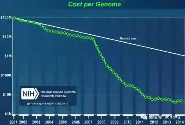 “相比第一代测序,二代测序技术最大的突破就在于通量的急剧提升,伴随而来的是测序成本出现几何级的下降。从2007年开始,人类基因组的测序成本每六个月下降一半,远超人们熟知的IT领域的摩尔定律(在固定成本下每18个月计算的速度增加一倍,即在固定计算能力下每18个月计算成本缩减一半),从16年前的单个测序成本9526万美元降到今天的800美元。”周代星说,这张超摩尔定律的图表最初就是来自于他曾供职的测序界巨头Illumina。而以现在的技术储备,Illumina能在约一年半的时间让测序成本降至100美元。