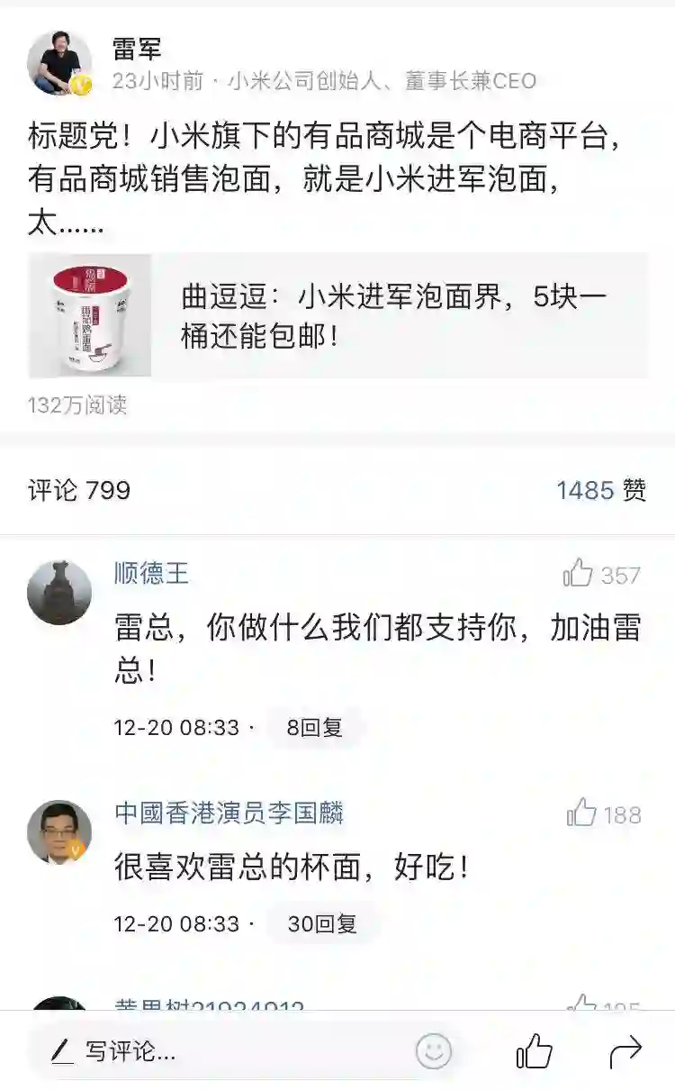 近日,针对“小米进军泡面”的消息,雷军今日在今日头条上的微头条上进行了回复,其表示:“标题党!小米旗下的有品商城是个电商平台,有品商城销售泡面,就是小米进军泡面,太……”,直接否认了小米进军泡面的消息。