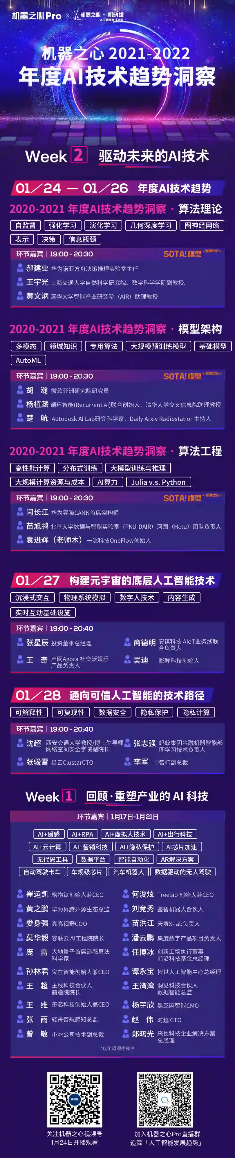 本年度线上分享会为期两周,分为两个主题周,第二周主题为「驱动未来的 AI 技术 —— 2021-2022 年度 AI 技术趋势洞察」,将于 2022 年 1 月 24 日——2022 年 1 月 28 日期间分为五日进行。 在接下来的一周,西安交大网络空间安全学院副院长沈超教授、华为诺亚方舟决策推理实验室主任郝建业教授、华为昇腾 CANN 首席架构师闫长江老师、ICCV 2021 马尔奖(最佳论文奖)Swin Transformer 作者微软亚洲研究院研究员胡瀚博士、上海交大自然科学研究院、数学科学学院王宇光教授、清华大学智能产业研究院黄文炳教授,一流科技 OneFlow 创始人袁进辉博士(老师木),循环智能联合创始人&清华大学交叉信息院助理教授杨植麟,以及来自北京大学崔斌教授指导的河图团队、上海科技大学孵化的科技创新公司影眸科技、AutoDesk AI Lab、蚂蚁集团、安谋科技、声网、源码资本、星云 Cluster、中智行科技等近 20 家机构的高校教授、技术专家及技术企业高管将分别做客机器之心「2020-2021 年度 AI 技术趋势洞察」直播间。 2022 年 1 月 24 日 —— 1 月 28 日精彩议程如下 2022 年 1 月 24 日(周一)至 1 月 28 日(周五)每晚 7 点至 9 点,近 20 位高校教授、技术专家及技术企业高管将做客机器之心「2020-2021 年度 AI 技术趋势洞察」直播间,共同探讨「通往第三代人工智能的理论之路如何走?」、「通用(大)模型的最后一公里」、「如何突破 AI 实践中的资源限制与壁垒?」、「构建元宇宙基础设施的 AI 技术」和「通向可信人工智能的技术路径」五个与 AI 技术人息息相关话题,洞察 AI 技术在「AI 算法理论」、「ML 模型架构」、「AI 算法工程化」及「热点 AI 应用技术」四大方面的发展趋势与潮水所向。关注机器之心机动组视频号,1 月 24 日晚 7 点开播!