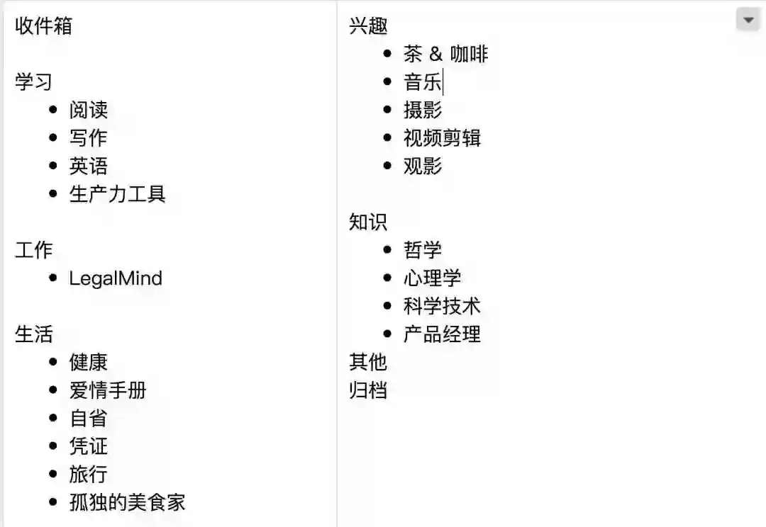 学习 - 阅读 - 写作 - 英语 - 生产力工具 工作 - LegalMind - 法律事务 生活 - 健康 - 爱情手册 - 自省 - 凭证 - 旅行 - 孤独的美食家 兴趣 - 茶 & 咖啡 - 音乐 - 摄影 - 视频剪辑 - 观影 知识 - 哲学 - 心理学 - 科学技术 - 产品经理 - 人工智能