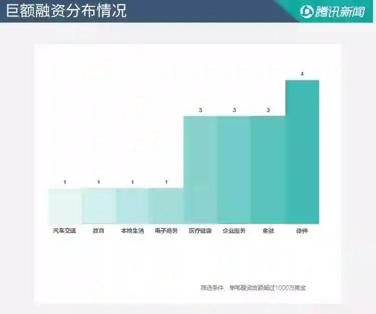 【单笔融资金额超过1000万美金的行业分布图】单笔融资金额超过1000万美金的融资事件共有17个,和上周相比下降2个,本周巨额融资事件主要集中在硬件领域。