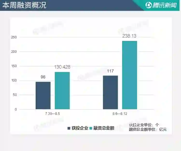【融资概况】本周国内共发生了117起投融资事件,累计金额超过238.13亿人民币,和上周相比,获投项目数量有及融资金额都显著上升。