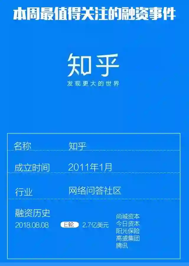 【最值得关注的融资项目】本周最值得关注的项目为网络问答社区知乎获得了2.7亿美金融资, 知乎上线于2011年,早期为需要邀请码才能注册的小众社区,目前已成长为了一个知识内容平台。 本轮融资后,知乎将加速全民知识内容平台的建设,加大在 AI 技术、内容生态、知识服务和商业化等多个维度的投入。