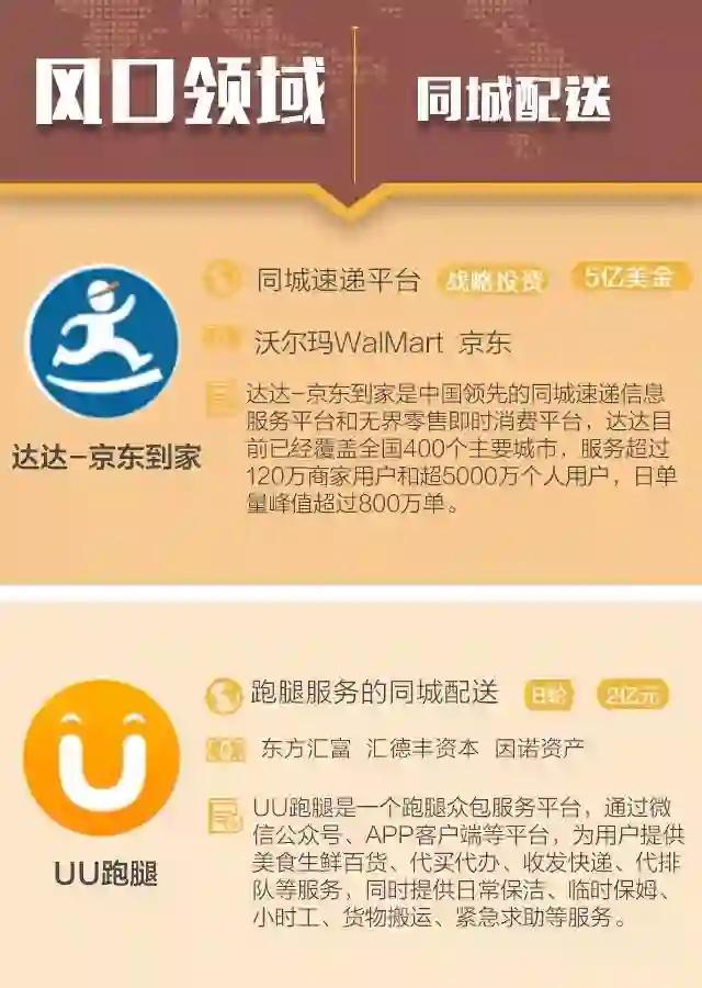 本周的风口行业为同城配送,其中最值得关注的项目为达达-京东到家获得5亿美金融资,以及UU跑腿获得2亿元B轮融资,达达成立于2014年 ,2016年4月达达和京东到家合并,目前京东到家业务日单峰值突破100万,达达也成长为日单峰值千万级的平台,达达-京东到家已逐渐成长为无界零售的基础设施。
