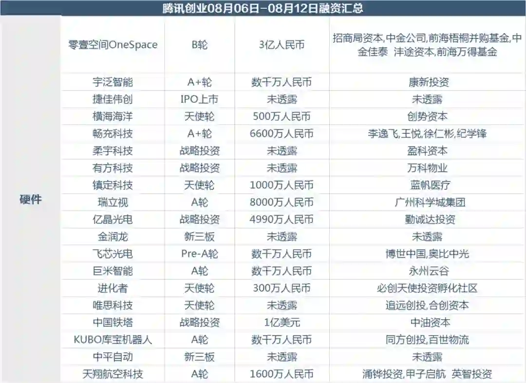 硬件领域本周共有19个项目获投,其中最值得关注的项目为航天科技公司零壹空间OneSpace获得融资,零壹空间OneSpace是一家主打航天器的科技公司,打造“中国版Space X”,目前正专注于第一款低成本小型运载器的研制、设计及总装,主营业务是为商用微小卫星等小型航天器提供专享发射服务。