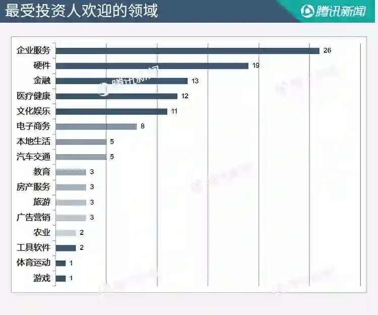 【最受投资人欢迎的领域】本周最受投资人欢迎的领域为企业服务共有26个项目获投和上周相比显著上升,其次为硬件领域本周共有19个项目获投和上周相比提高10个。