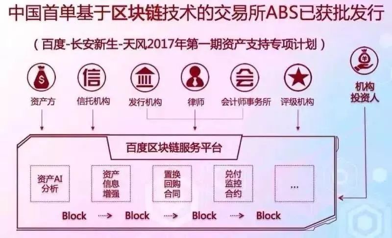2017年5月16日,百度金融与佰仟租赁、华能信托等在内的合作方联合发行国内首单区块链技术支持的ABS项目,这个ABS已经得到上交所批复,发行总规模4亿元;