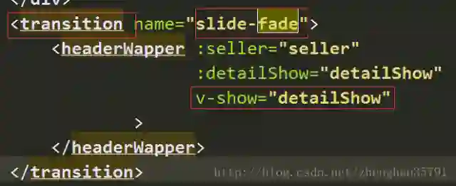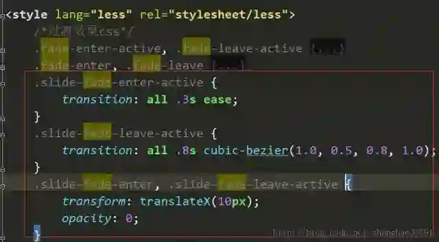 下图所示是一个简单的过渡效果的例子,需要将想实现过渡效果的元素放在transition标签中包裹,通过name=“slide-fade”来声明过渡效果名称,并在对应的vue文件中添加过渡效果 的css样式,这样就可以简单的完成该元素的过渡效果。