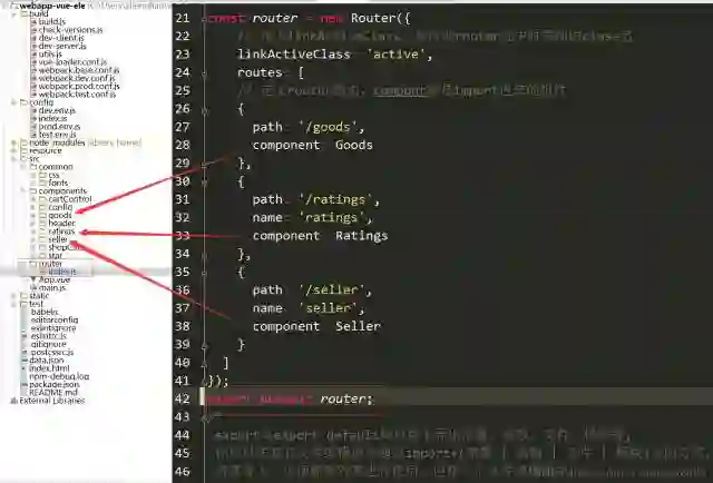 通过import导入并定义Vue模块、vue-router模块和需要使用的组件,在本例中,分别是Goods、Ratings和Seller组件。最后,如果在一个模块化工程中使用它,必须要通过 Vue.use() 明确地安装路由功能。