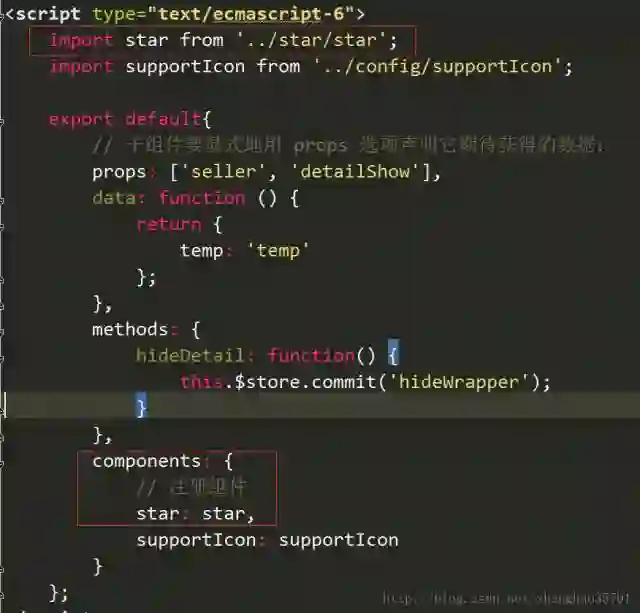 如何在其他的vue文件中使用这个star组件呢?如下图所示,首先通过import引入star组件对象,并在想使用star组件的vue文件中声明注册star组件。现在就可以愉快的通过标签来在该vue文件中任意地方使用star组件了。在你想展示一个五角星的地方,使用一个star标签,就可以轻松完成这个功能。