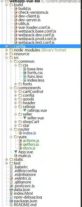 下图是一个简单的vue项目的大概结构,下面简要介绍一下每个文件夹中一般都会存放哪些内容。