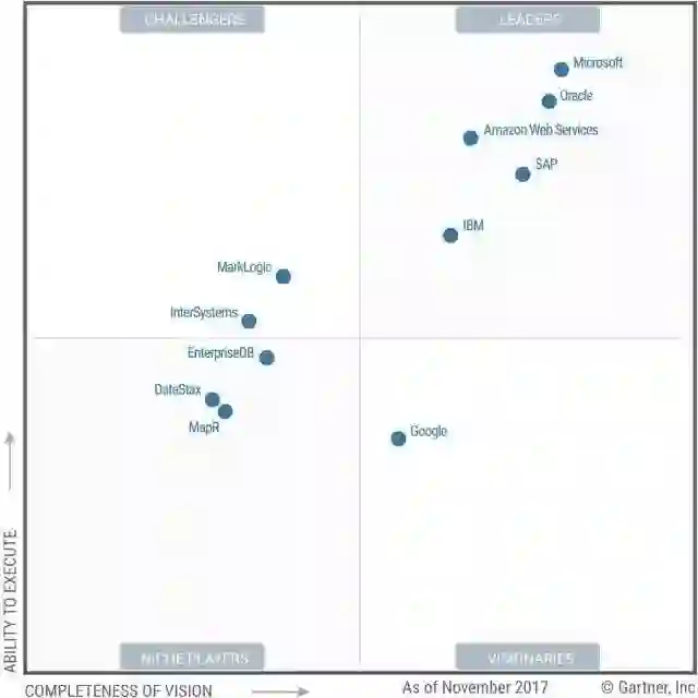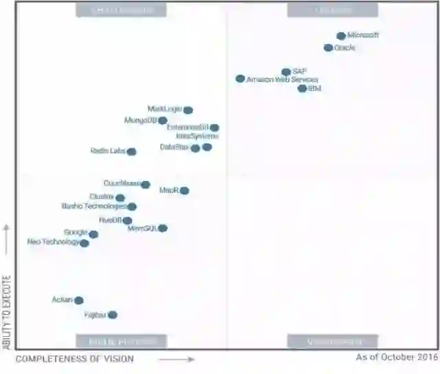 在谈论OceanBase未来的时候,我想先聊聊上面这三张图。这是Gartner的魔力象限图,对最近三年操作型数据库管理系统的分析。有意思的是,2015年收录了31家公司,其中一大堆领导者;第二年还有21个,基本上领导者就只剩下微软SQL Server,Oracle,SAP,亚马逊和IBM了,去掉了一半不赢利(死掉)的;到了2017年,只剩下11家,微软和Oracle仍然稳如磐石,亚马逊继续上升,SAP落到第四,IBM与前三名差距拉大。因为推出了Spanner,谷歌从一招鲜玩家杀入到远见者。因为不赢利,MongoDB居然都能被干掉。从上面可以看到,在数据库这样一个非常成熟的细分领域里,最近三年居然产生了如此剧烈的变化,这意味着什么?会不会像当年分布式计算和虚拟化催生了云计算一样,数据库领域也会产生类似的变化?这一现象背后的趋势,值得我们深思。