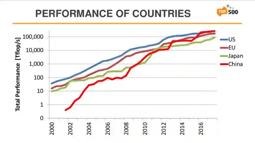 ▲2000年-2017年,HPC Top500主要国家和地区的系统性能总和走势图