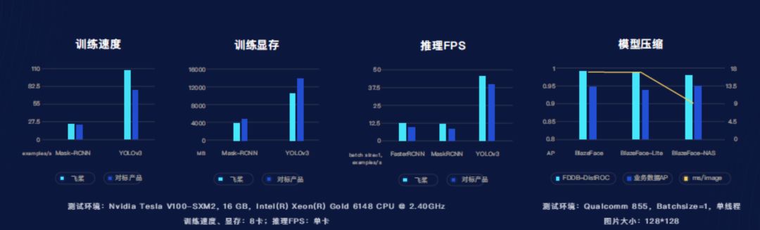 本次发布还进一步增强了 YOLOv3,基于 COCO 的 mAP 再进一步提升至 41.4%,GPU 上的推理速度进一步提升。本次还发布了 BlazeFace 等系列人脸检测模型,同时还发布了自研的搜索版本 BlazeFace,模型大小压缩三倍的情况下,大幅提升预测速度。特别强调一下,预训练模型中的行人检测和车辆检测的模型,是基于百度内部的业务数据得到效果不错的模型,值得推荐。