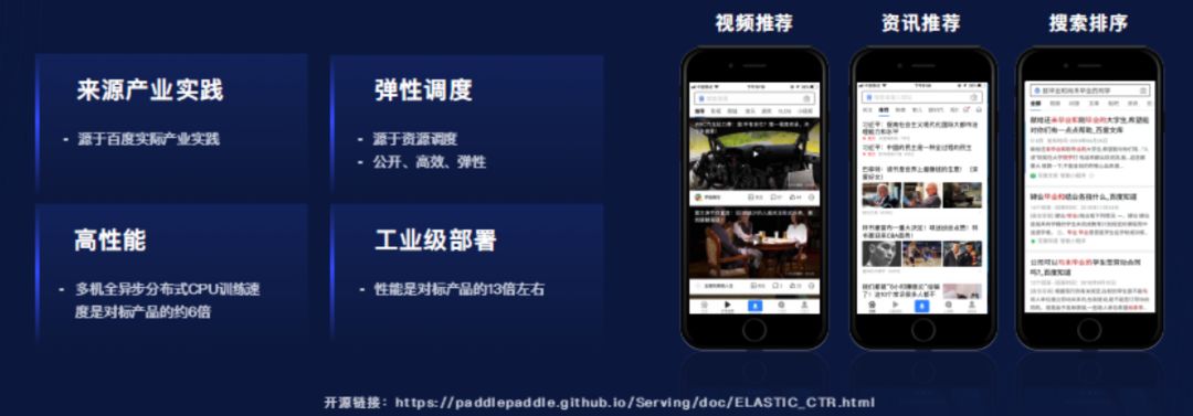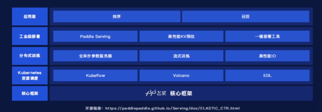 ElasticCTR 个性化预估,是工业推荐场景下的常见需求,与工业实践的关联度非常高。以飞桨核心框架为核心,ElasticCTR 实现了大量的技术突破:通过与资源调度平台深度集成提高资源调度的效率;在分布式训练的环节,提供全异步的参数服务器方案、流式训练和高性能的 IO 接口;最终,通过高性能的 KV 预估和一键部署工具实现工业级部署。