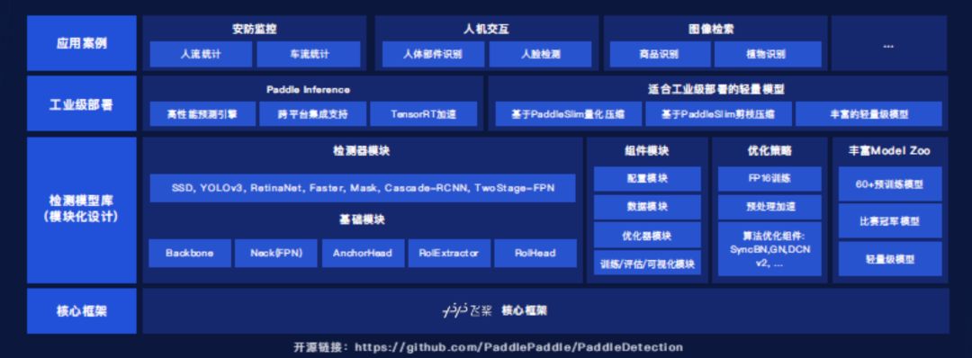PaddleDetection 是基于飞桨核心框架,结合百度科研和业务的需求,构建的目标检测开发套件。从全景图可以看到,套件中主要不仅包含各个检测算法实现,而且提供一系列的优化组件,以及更好的辅助调试的可视化的模块。同时,还提供了加速训练相关的混合精度的训练模块以及丰富的算法组件。