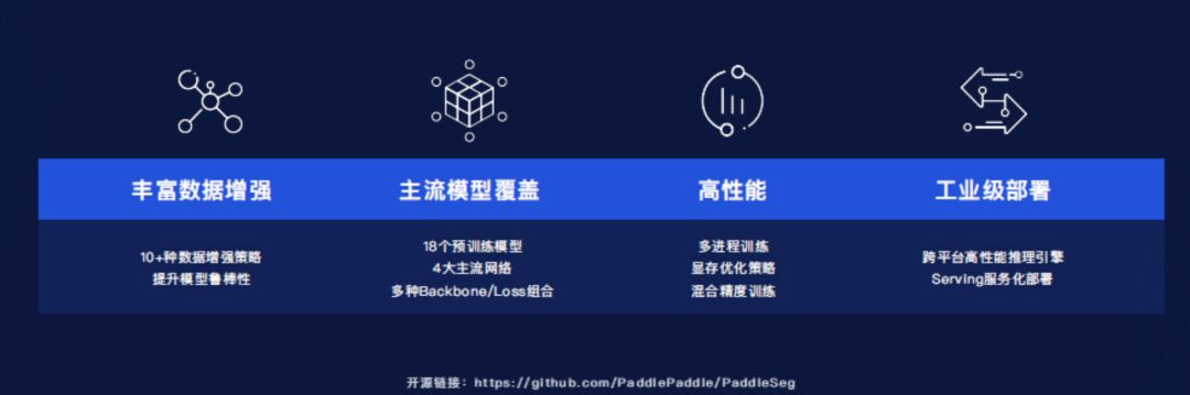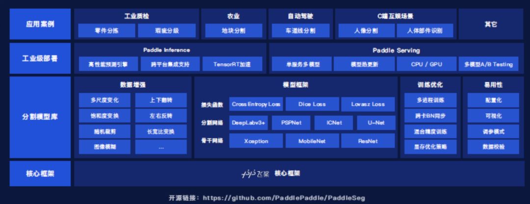 图像分割开发套件基于飞桨的核心框架,主要做了以下方向的建设:一是数据增强,将工业级常用分割算法开放出来;二是在模型层使用模块化的设计,将整个分割的模型拆分成三块,包括骨干网络、分割网络和模型损失函数。拆解之后,可以让这些模块自由组合,能够解决特定场景的问题。三是在训练场景上,PaddleSeg 里面做了大量性能方面的优化,在显存优化和预测速度上都做了大量的工作。四是易用性方面,通过实际的项目打磨验证,找到使用过程当中的痛点并且解决掉。训练模型工业级部署,开发套件也做了集成,可以帮助广泛开发者使用。
