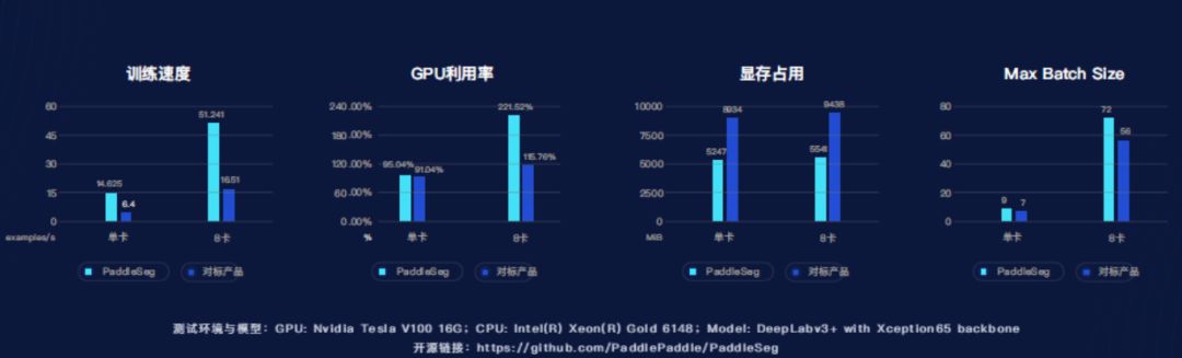 PaddleSeg 在性能优化方面开展了很多工作。包括训练速度提升、GPU 利用率提升以及显存性能优化。同时支持较新的 FP16 混合精度的训练。特别的,对于动态的 Loss Scaling,在不损失精度的情况下,性能可以有 30% 的提升。PaddleSeg 在英伟达特斯拉 V100 卡上,单卡训练速度是对标产品的 2.3 倍,多卡上是对标产品的 3.1 倍。