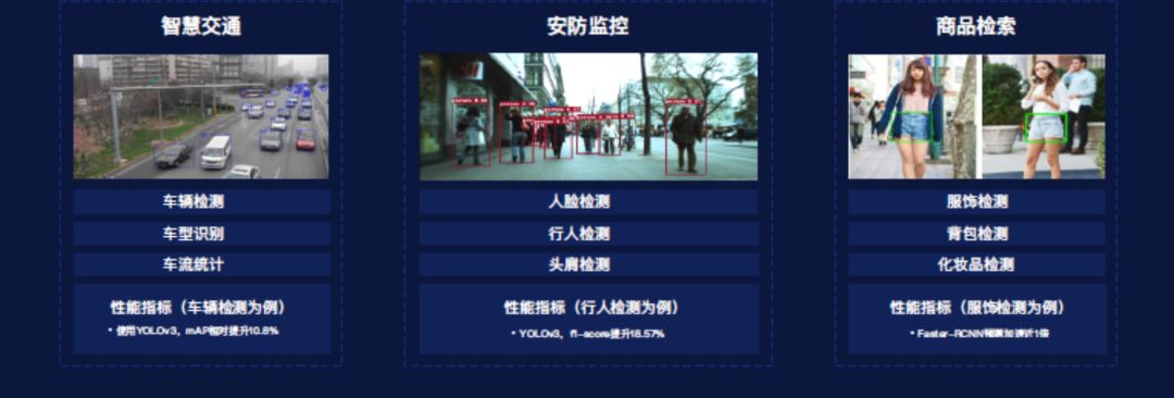 PaddleDetection 目前已经广泛的在智慧交通、安防监控和商品检索上实现落地引用,并且取得了良好的应用效果。