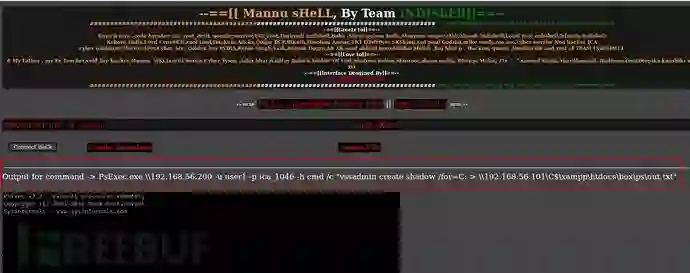 Web shell显示psexec正在远程Windows AD域控机器上执行命令。如果一切顺利,我们将在目录“C:\xampp\htdocs\box\ps”中获取到一个名为“out.txt”的文件,它将包含在AD域控(192.168.56.200)上执行的“vssadmin list shadows”命令的输出。