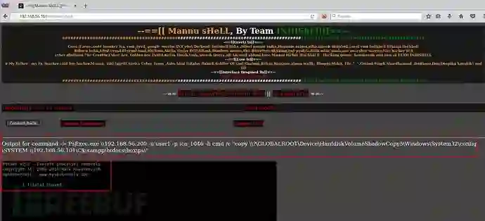 以上命令,psexec正在Windows AD域控机器(192.168.56.200)上执行命令创建“C”盘的卷影副本,然后将该命令的输出重定向到 “LABONE”机器的 “C:\xmpp\htdocs\box\ps\out.txt”文件中。