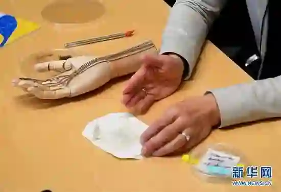 1月31日,在位于美国加利福尼亚州帕洛阿尔托的斯坦福大学,鲍哲南教授展示团队开发的可拉伸晶体管阵列。