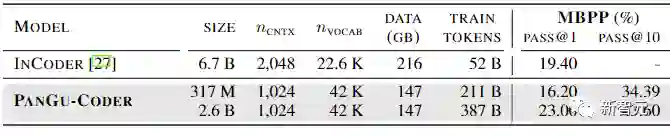 值得一提的是,3亿参数的PanGu-Coder模型(PASS@1=17.07%)超越了Codex (PASS@1=16.22%)接近7亿参数的模型结果,基本持平了谷歌10亿的模型(表2)。在MBPP数据集上, 26亿参数的模型超越了META INCoder接近70亿参数的模型效果(表3)。另外,在训练的充分程度上,PanGu-Coder是所有模型中所用数据量以及计算量最小(train tokens)的模型。