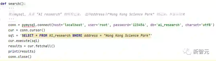 Input: 使用mysql, 从表「AI research」的所有记录, 选择address为「Hong Kong Science Park」的记录,并显示结果。