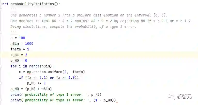 Input: One generates a number x from a uniform distribution on the interval [0, θ].One decides to test H0 : θ = 2 against HA : θ = 2 by rejecting H0 if x ≤ 0.1 or x ≥ 1.9.Using simulations, compute the probability of a type I error.